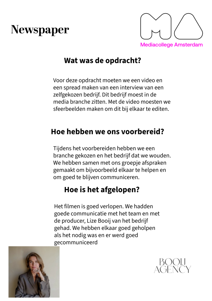 Voor dit project moesten we in groepjes samenwerken. Bij deze opdracht moesten we een video maken van een interview en vervolgens er een spread over schrijven.
